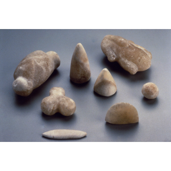 Description: Alabaster model food offerings from G 4733 E: meat joint, upper left (14-2-63 = MFA 21.2824); tall conical bread loaf, center (14-2-51 = MFA 21.2830); trussed duck, upper right (14-2-65 = MFA 21.2818); three-part rounded model, center left (14-2-48 = MFA 14.1222, one of five); flat fruit or vegetable, lower left (14-2-56 = MFA 21.2834); small conical bread loaf, center right (14-2-51 = MFA 21.2832); spherical model, right (14-2-64 = MFA 14.1235, one of five); semi-circular model, lower right (14-2-60 = MFA 14.1233)