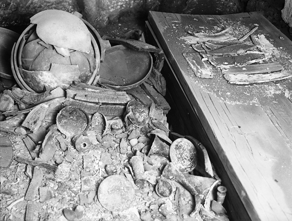 Description: Senedjemib Complex: G 2381 A, Impy, burial chamber, wood coffin (12-12-575 = MFA 13.3085) and deposit of pottery and copper models after removal of top layer, looking S