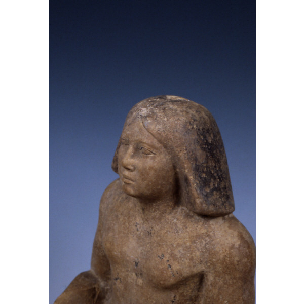 Description: Limestone seated scribe statue of Khuenre from Menkaure quarry cemetery, MQ 1 = MQ 137 (detail, quarter view proper left): 13-1-560 (= MFA 13.3140)