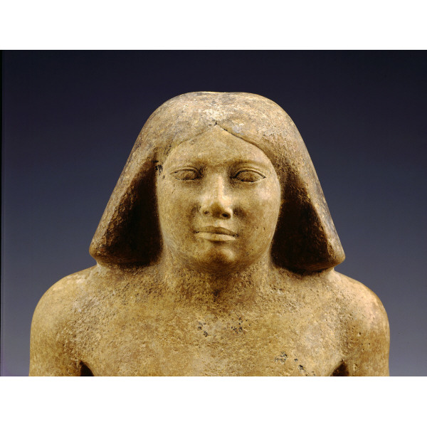 Description: Limestone seated scribe statue of Khuenre from Menkaure quarry cemetery, MQ 1 = MQ 137 (detail, front): 13-1-560 (= MFA 13.3140)