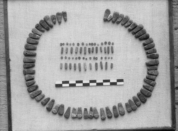 Description: Jewelry elements: selection of beads from G 2407 C: 36-4-80 (= MFA 37.1314): a) fifty-eight [GLYPHS] pendant beads, b) cylinder beads, c) ring beads