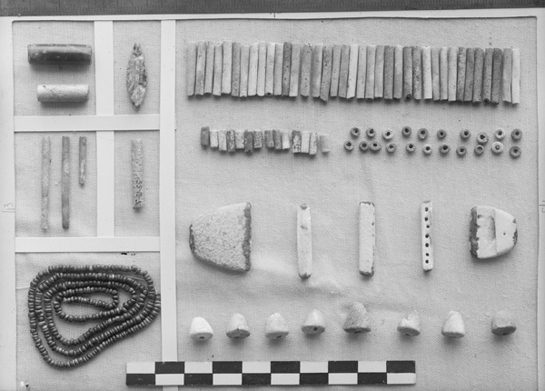Description: Jewelry elements: upper left (left): [G 1231 (= G 1234) B] 34-10-28a (= MFA 37.1329, cylinder bead), 34-10-29a (= MFA 37.1330, cylinder bead); upper left (right): [G 2422] 36-6-13 (= MFA 37.1333, amulet); middle left (left): [G 4811+4812: G 4811 B] 35-11-72 (three cylinder beads); middle left (right): [G 2347a A (= G 5563 A)] 35-10-30 (cylinder bead); bottom left: [G 1102 F] 35-1-27 (= MFA 37.1313, ring beads); right: [G 4516 C] 35-8-54 (a + c + d + f = MFA 37.1335, e = MFA 37.1328): top row: c) long cylinder beads; second row: b) short cylinder beads, a) ring beads; third row: f) two terminals, d) three spacers; bottom row: e) bell-shaped pendants