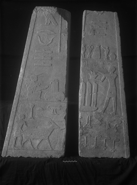 Description: Blocks of relief from G 2150, Kanefer: 32-12-7a (= MFA 34.58, from S door jamb), 32-12-8 (= MFA 34.57, from N door jamb, figure of ka-priest Nakhtka)