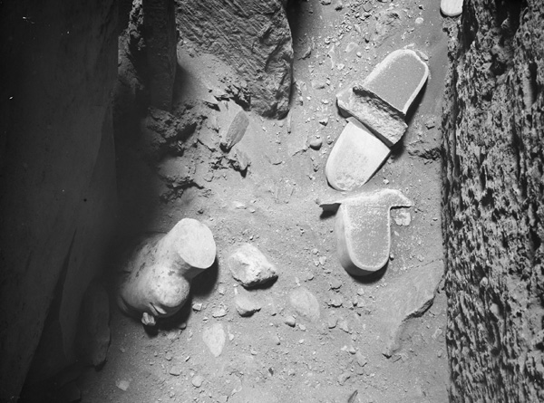 Description: Cemetery G 2100: G 2110 A, limestone reserve head attributed to Nefer (MFA 06.1886) and sarcophagus lugs in situ at entrance of burial chamber [Image also known as: C12528_NS]