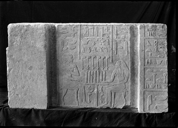 Description: Block of relief (false door tablet) from G 2041, [GLYPHS] Senenuka, chapel, W wall, unfinished S false door, including tablet with Senenuka and Iti seated at offering table: part of nine fitting blocks of relief = MFA 07.1000 + MFA 07.1001 + MFA 07.1003 + MFA 07.1004 + MFA 07.1005