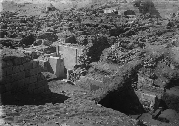 Description: Cemetery G 2000: G 2041, Senenuka, chapel, including W wall (MFA 07.1000 + MFA 07.1001 + MFA 07.1003 + MFA 07.1004 + MFA 07.1005) in situ, looking SW. [Image also known as: B7410_NS]