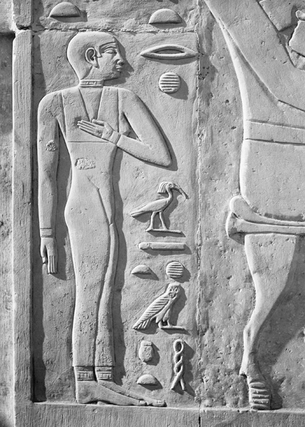 Description: Cemetery G 2000: G 2041, Senenuka, chapel, W wall (MFA 07.1000 + MFA 07.1001 + MFA 07.1003 + MFA 07.1004 + MFA 07.1005), detail of relief, standing figure of Akhetemhenut, looking W. [Image also known as: C12353_NS]