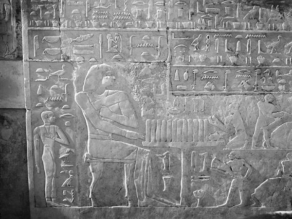 Description: Cemetery G 2000: G 2041, Senenuka, chapel, W wall (MFA 07.1000 + MFA 07.1001 + MFA 07.1003 + MFA 07.1004 + MFA 07.1005), detail of central portion of relief, including Senenuka seated at offering table with his daughter Akhetemhenut standing behind and ka-priest Ini offering haunch of meat, looking W. [Image also known as: C12351_NS]