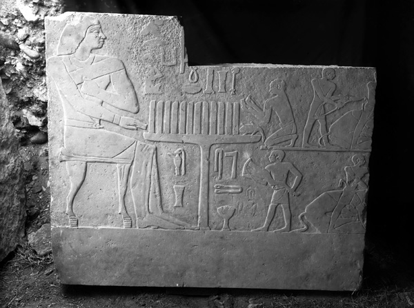 Description: Block of relief with figure of Senenuka seated at offering table and ka-priest Ini offering haunch of meat from G 2041, Senenuka, chapel, W wall: part of nine fitting blocks of relief = MFA 07.1000 + MFA 07.1001 + MFA 07.1003 + MFA 07.1004 + MFA 07.1005