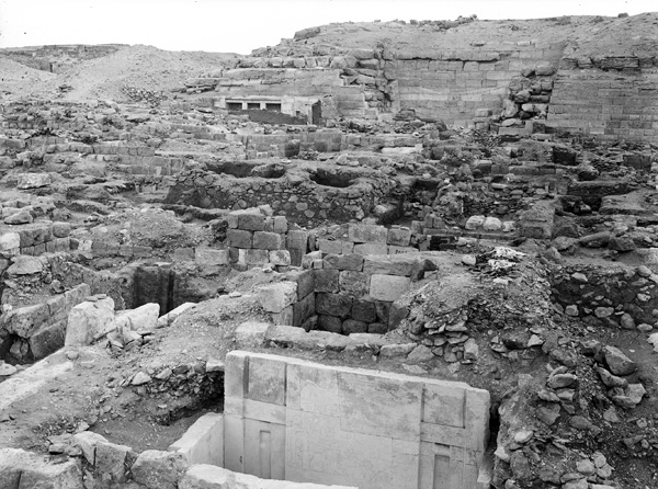 Description: Cemetery G 2000: G 2041, Senenuka, chapel, W wall (MFA 07.1000 + MFA 07.1001 + MFA 07.1003 + MFA 07.1004 + MFA 07.1005) (foreground), looking WSW across cemetery G 2000 to E face of G 2000 (= Lepsius 23) S chapel niche and pillared portico of G 2001. [Image also known as: A5963_NS]