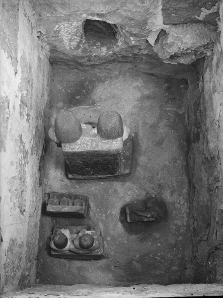 Description: Cemetery G 2000: G 2009, serdab, roofing removed, statues (standing pair statue = Cairo JE 38670, seated pair statue = MFA 06.1885, triad = MFA 06.1882, statue of boy = MFA 06.1881) in situ, looking E. [Image also known as: C12114_NS]