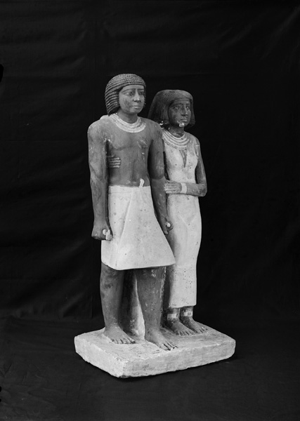 Description: Painted limestone standing pair statue of Ptahkhenui and his wife (name not preserved) from G 2004, serdab (quarter view proper right): MFA 06.1876. [Image also known as: B7358_NS]