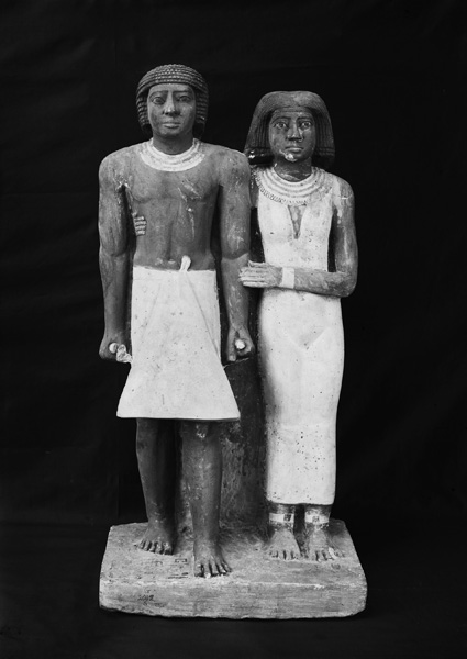 Description: Painted limestone standing pair statue of Ptahkhenui and his wife (name not preserved) from G 2004, serdab (front): MFA 06.1876. [Image also known as: B7806_NS]