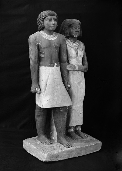 Description: Painted limestone standing pair statue of Ptahkhenui and his wife (name not preserved) from G 2004, serdab (quarter view proper right): MFA 06.1876. [Image also known as: B7359_NS]