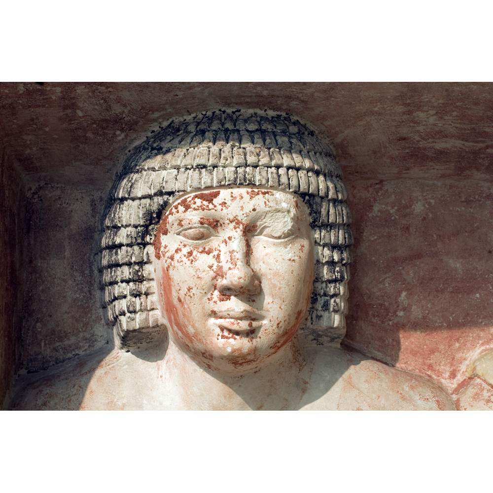 Description: Painted limestone pseudo-group statue depicting two figures of Penmeru, his wife Meretites, his son Seshemnefer, and his daughter Neferseshemes from G 2197, serdab S (detail, head of proper right figure): MFA 12.1484