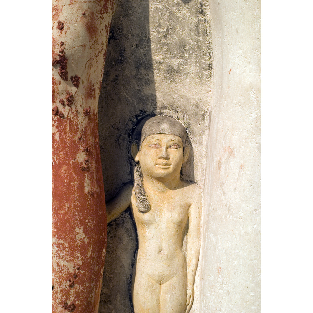 Description: Painted limestone pseudo-group statue depicting two figures of Penmeru, his wife Meretites, his son Seshemnefer, and his daughter Neferseshemes from G 2197, serdab S (detail, small proper left figure): MFA 12.1484