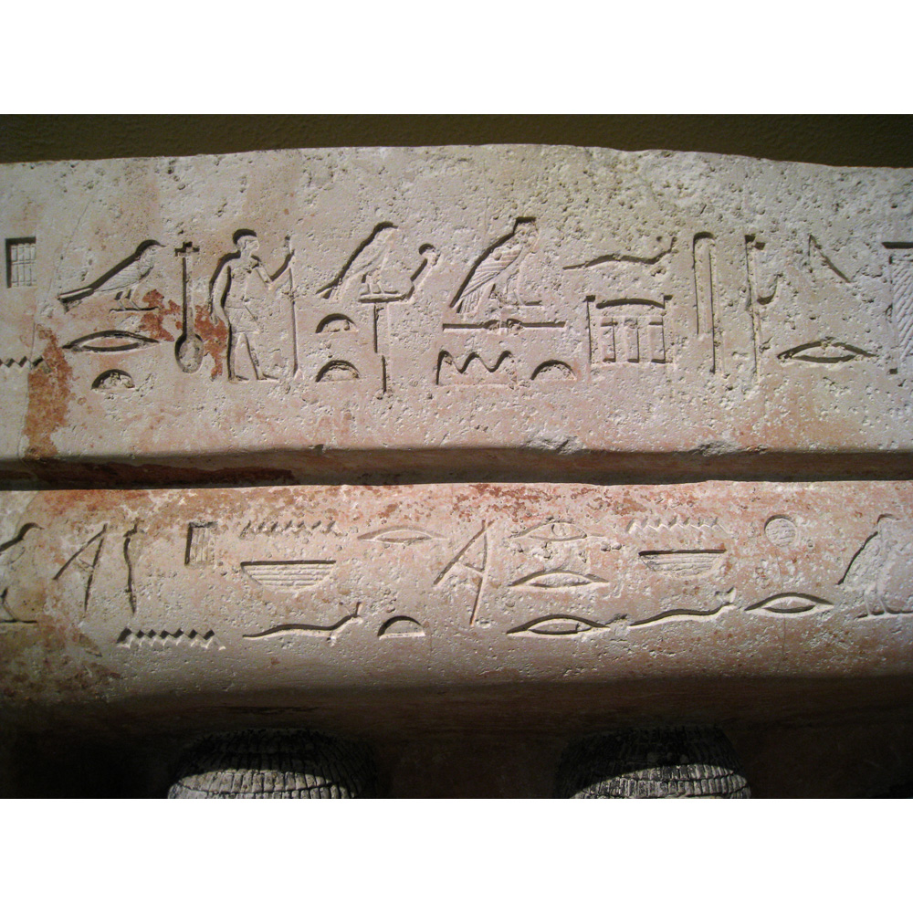 Description: Painted limestone pseudo-group statue depicting two figures of Penmeru, his wife Meretites, his son Seshemnefer, and his daughter Neferseshemes from G 2197, serdab S (detail of text, niche face, lintel and drum lintel, middle): MFA 12.1484
