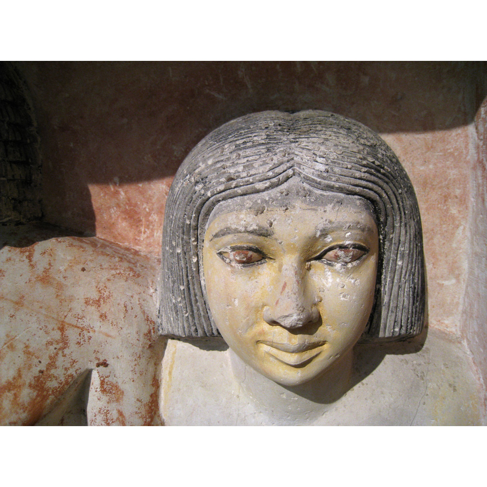 Description: Painted limestone pseudo-group statue depicting two figures of Penmeru, his wife Meretites, his son Seshemnefer, and his daughter Neferseshemes from G 2197, serdab S (detail, head of proper left figure, top view): MFA 12.1484