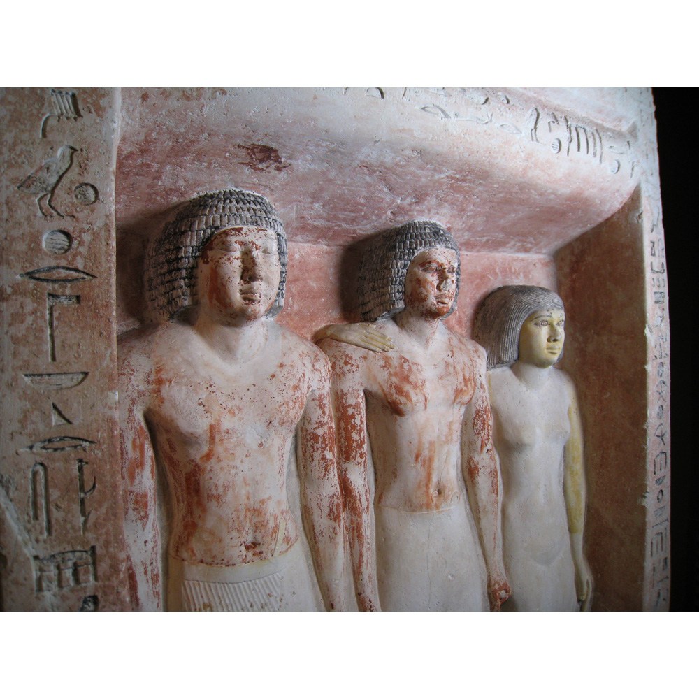 Description: Painted limestone pseudo-group statue depicting two figures of Penmeru, his wife Meretites, his son Seshemnefer, and his daughter Neferseshemes from G 2197, serdab S (detail, upper portion, quarter view proper right): MFA 12.1484