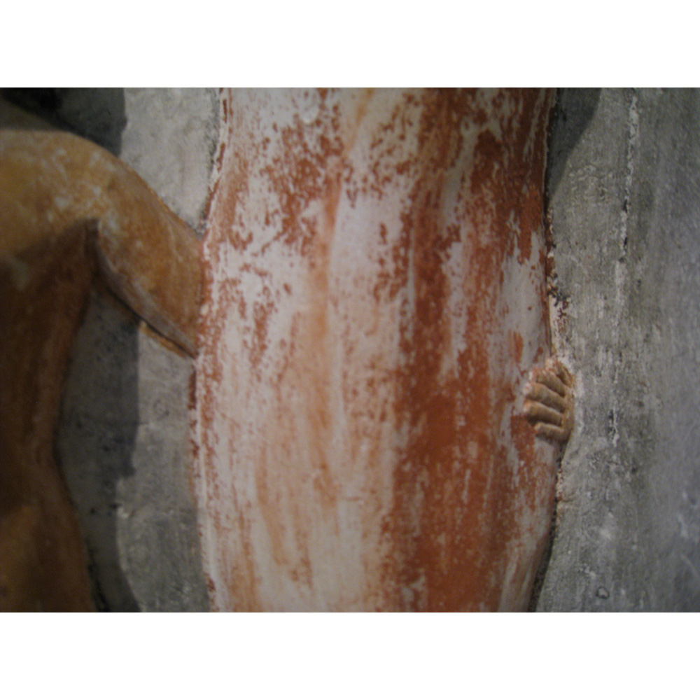 Description: Painted limestone pseudo-group statue depicting two figures of Penmeru, his wife Meretites, his son Seshemnefer, and his daughter Neferseshemes from G 2197, serdab S (detail, middle figure leg and small proper right figure arm): MFA 12.1484