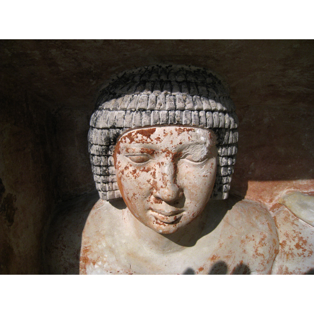 Description: Painted limestone pseudo-group statue depicting two figures of Penmeru, his wife Meretites, his son Seshemnefer, and his daughter Neferseshemes from G 2197, serdab S (detail, head of proper right figure, top view): MFA 12.1484