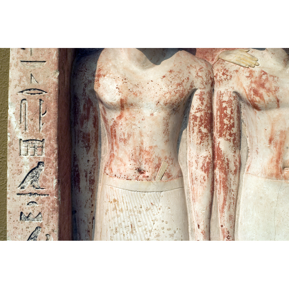 Description: Painted limestone pseudo-group statue depicting two figures of Penmeru, his wife Meretites, his son Seshemnefer, and his daughter Neferseshemes from G 2197, serdab S (detail, middle portion, proper right): MFA 12.1484
