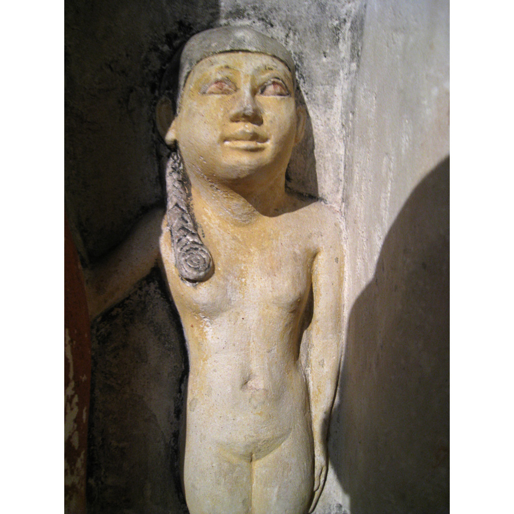 Description: Painted limestone pseudo-group statue depicting two figures of Penmeru, his wife Meretites, his son Seshemnefer, and his daughter Neferseshemes from G 2197, serdab S (detail, small proper left figure): MFA 12.1484