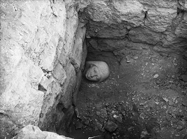 Description: Cemetery G 5000 (cemetery G 2100): G 2191 B, head of granite statue attributed to Seshemnefer [II] (MFA 12.1487) in situ in pit (head perhaps originally from G 2200 = G 5080), looking N