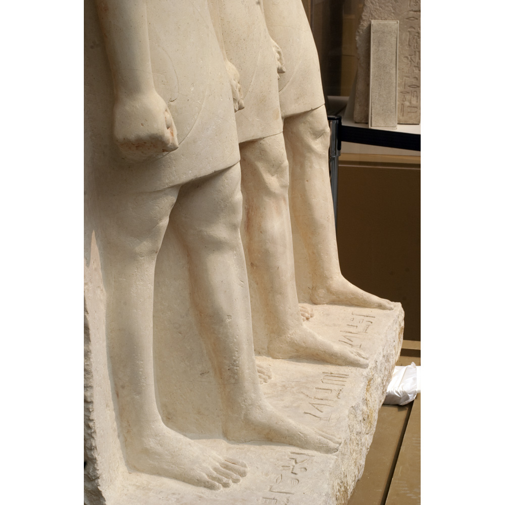 Limestone triad of Penmeru from G 2197, serdab N (detail, lower portion, quarter view proper right): MFA 12.1504