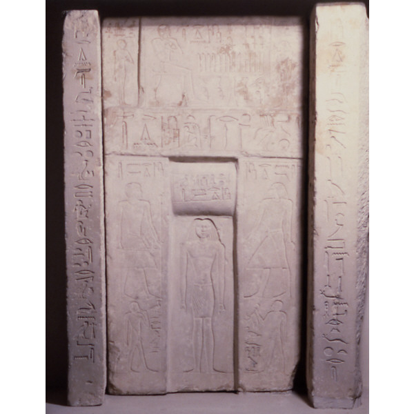 Description: Limestone false door niche of Redines (his wife Meretites, daughter Ankhreput, and sons Rekhuief and Khnumhesuef depicted on tablet flanges and lower jambs) from G 5032: MFA 21.961a-c