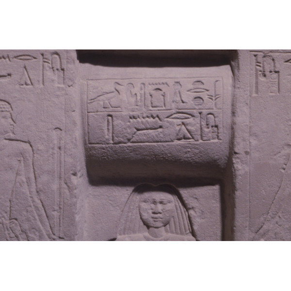 Description: Limestone false door niche of Redines from G 5032, detail of false door central niche, drum lintel and figure of Redines: MFA 21.961a-c