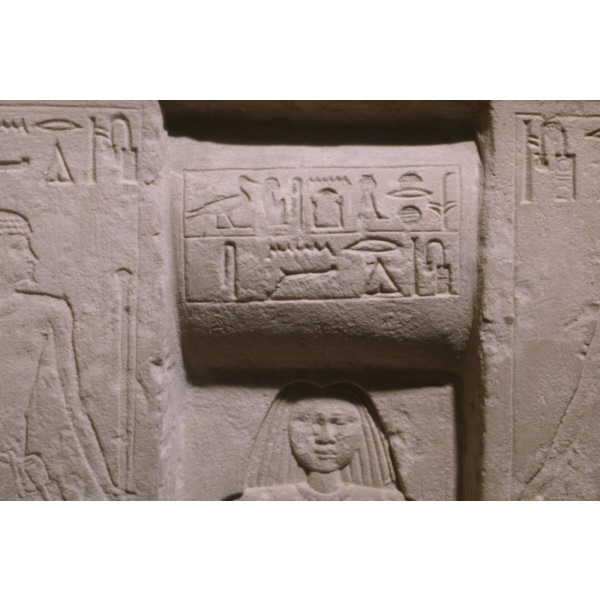 Limestone false door niche of Redines from G 5032, detail of false door central niche, drum lintel and figure of Redines: MFA 21.961a-c