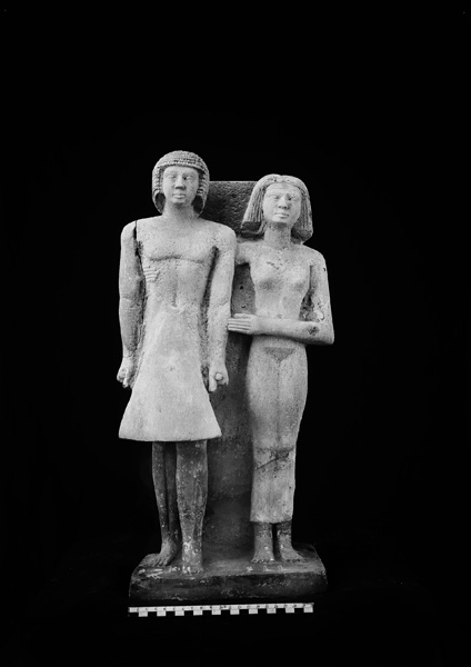 Limestone standing pair statue (no. 5) inscribed for [GLYPHS] Ikhui and Bebi from G 2415, serdab (front): MFA 21.2597