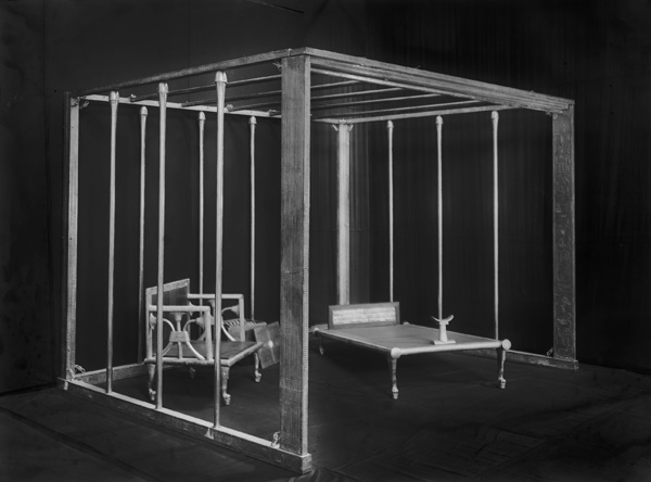 Description: G 7000 X, Hetepheres I, furniture: canopy (reconstruction = Cairo JE 57711, reproduction = MFA 38.873) with bed (reconstruction = Cairo JE 53261, reproduction = MFA 29.1858) and headrest (reconstruction = Cairo JE 53262, reproduction = MFA 29.1859), arm chair (reconstruction = Cairo JE 53263, reproduction = MFA 38.957), jewel box (reconstruction = Cairo JE 53265), view from left