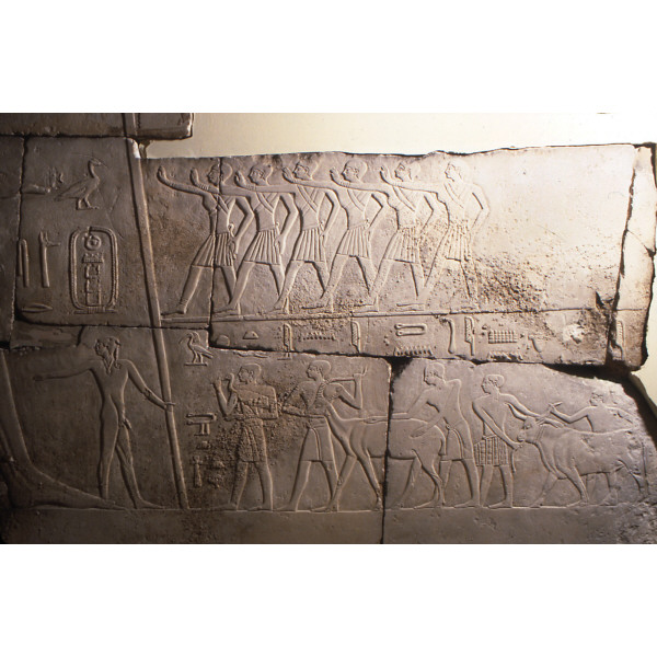 Description: Museum of Fine Arts, Boston: detail of limestone relief from N wall of G 2175, Khnumnefer and Nedju, chapel of Khnumnefer (scene of Khnumnefer, his wife Ankhesenptah(?), and three children, Menkaure-weser, Hepetka, and Nikauneith, with procession of dancing girls and offering bearers in livestock procession, identified as Akhitef, Iyni, Tjenti, Menib, Peri): MFA 12.1512.1–MFA 12.1512.14