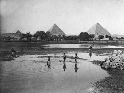 Village children playing in the receding inundation waters southeast of the Giza plateau; November 24, 1927 (D1032)
